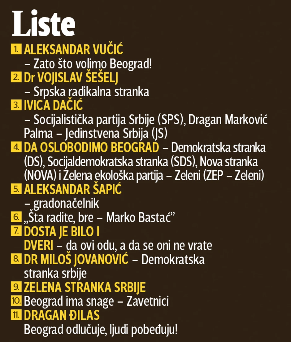 Od kada su raspisani beogradski izbori, 11 stranaka i udruženja predalo je svoje liste. Očekivano, prvi su to učinili naprednjaci, dok je za sada poslednja lista Dragan Đilas – Beograd odlučuje, ljudi pobeđuju.