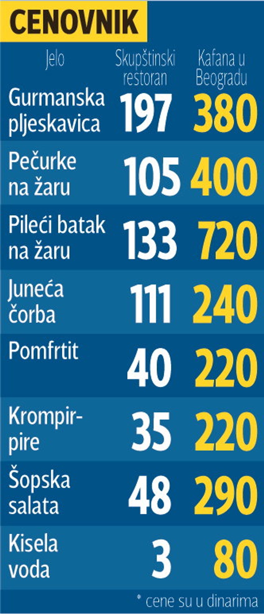 Cena supe i čorbe su od 31 do 111 dinara, dok je od riba najjeftiniji oslić - 151 dinar, a najskuplja orada na žaru za koju je cena po kilogramu 1.648 dinara. Poslanici mogu da izaberu i neko od gotovih jela čija je cena od 120 do 253 dinara, uz kupus salatu od 14 dinara. Od jela sa roštilja, na meniju su se našli gurmanska pljeskavica, rolovani ćevap u slanini, leskovački uštipci, roštilj kobasica, rolovani pileći file, pileći batak na žaru, svinjski vrat na žaru, dimljeni vrat, bela vešalica i ramstek na žaru. Raspon cena od 133 do 278 dinara. Na kraju poslastica - može i grčka baklava za 52 dinara.