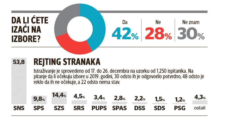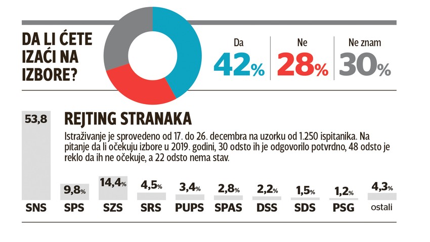 Sem SNS, očigledno je da su i građani spremni za izbore jer je, prema najnovijem istraživanju agencije "Faktor plus", njih 42 reklo da će izaći na izbore. Njih 28 odsto je reklo da neće, a 30 odsto ispitanika nije znalo šta da odgovori.