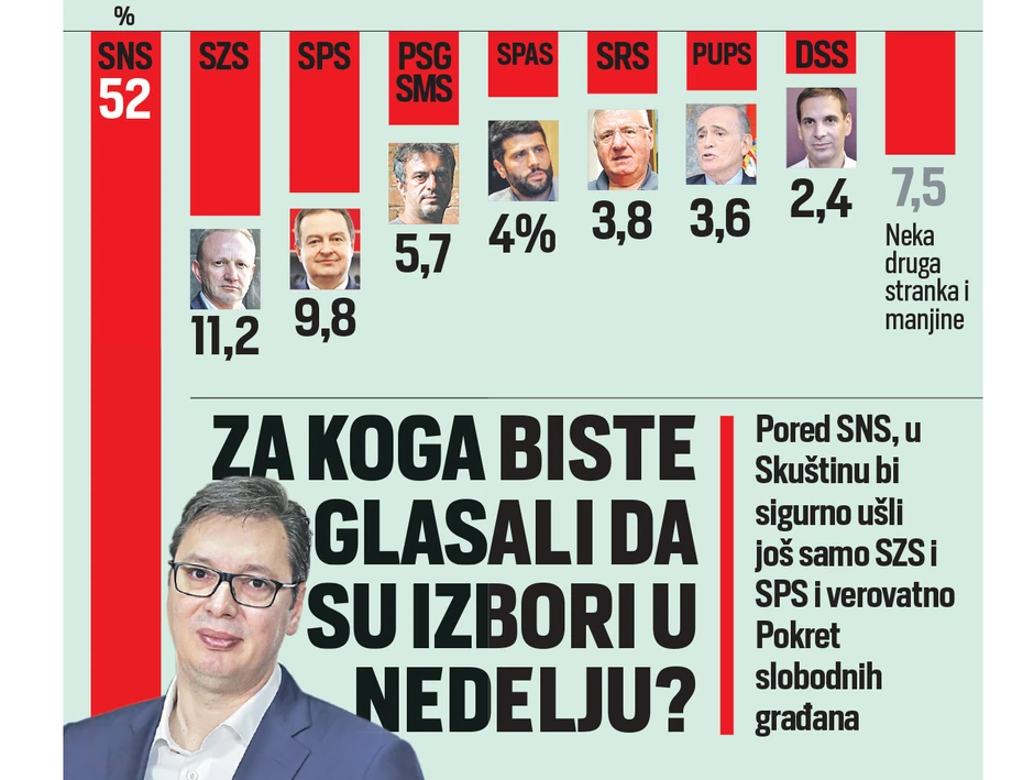 Nešto ispod cenzusa su Srpski patriotski savez (SPAS) Aleksandra Šapića koji podržava četiri odsto ispitanika i Srpska radikalna stranka koju bi na glasačkom listiću zaokružilo 3,8 odsto. PUPS ima podršku od 3,6 odsto, a DSS 2,4 procenta.