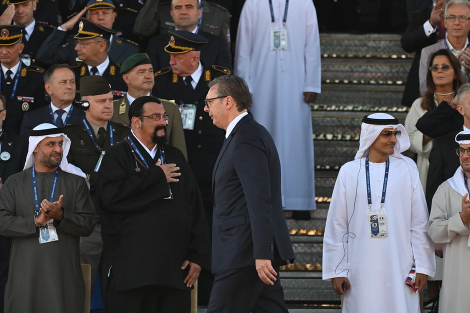 Među zvanicama na vojnoj paradi "Snaga jedinstva 2025" u Beogradu nalazi se i holivudski glumac Stiven Sigal. On se pozdravio sa predsednikom Srbije Aleksandrom Vučićem, a zauzeo je mesto u prvom redu.
