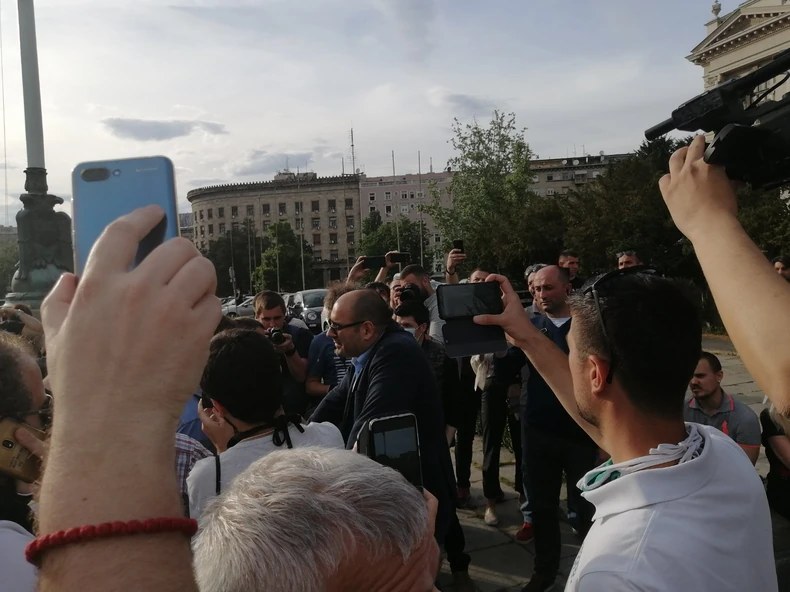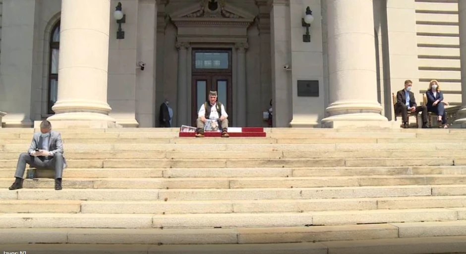 Boško Obradović je u jednom momentu ušao u zgradu Narodne skupštine, zatim izašao, kako je rekao, po punjač za mobilni telefon, i zatim se vratio u zgradu.