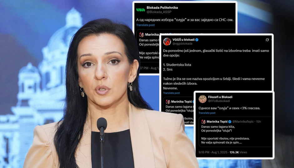 Studenti u blokadi nekoliko fakulteta oštro su napali potpredsednicu Stranke slobode i pravde Mariniku Tepić nakon što je ona upotrebila reč "oluja" kada je komentarisala jučerašnje hapšenja više osoba osumnjičenih u slučaju tragedije na Železničkoj stanici u Novom Sadu. Studenti su joj tom prilikom poručili da sledi "od narednih izbora oluja i za njih zajedno sa SNS-om" ali i da je "tužno šta se sve naziva opozicijom u Srbiji".