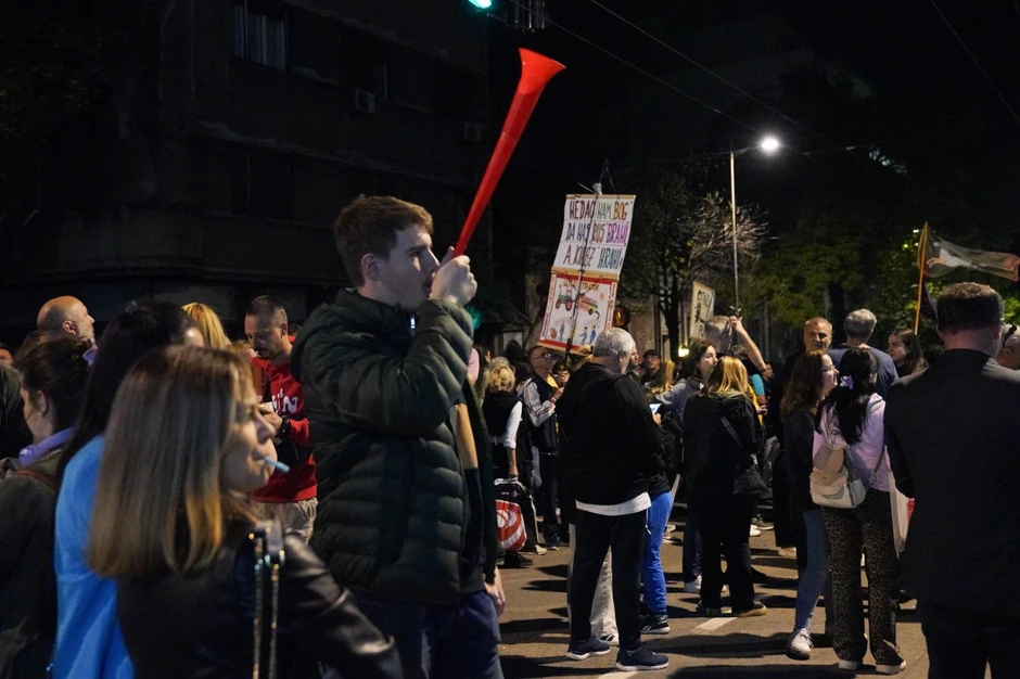 Studenti u blokadi stoje na ulici i šetaju, prave buku pištaljkama, bubnjevima i vuvuzelama.