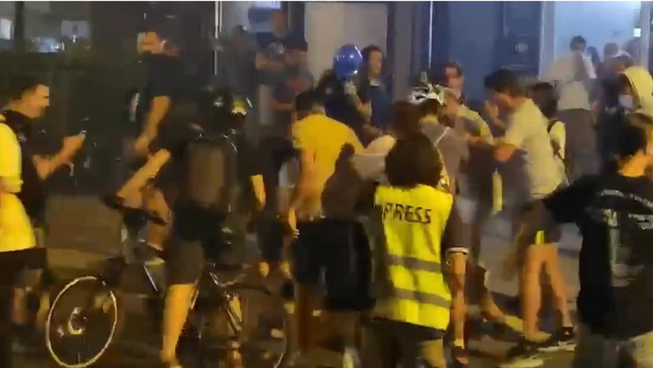 Na snimku koji je objavljen na društvenim mrežama vidi se nekoliko desetina demonstranata kako šutiraju čoveka koji je na zemlji.