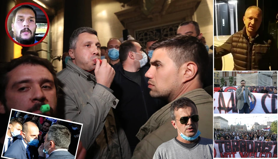 Dan kasnije nije bilo tako: poslanici iz redova "Dveri" sačekali su poslanike i ministre iz redova SNS na ulazu u skupštinu, a najdeblji kraj izvukao je Marjan Rističević. Iscepanog sakoa i sa tragovima krvi na zaštitnoj maski, Rističević se nekako probio u hol parlamenta. Negde između ta dva događaja, stao je još jedan igrokaz lidera "Dveri", koji je prekinuo zasedanje sednice pištaljkom. Iz sele je izguran uprkos tome što se držao za barjak Srbije.