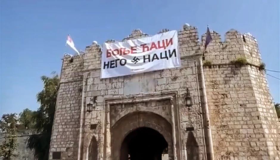 Na Niškoj tvrđavi postavljen je pa sklonjen transparent sa natpisom "Bolje ćaci, nego naci"