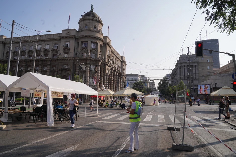 Protest koji su organizovali okupljeni oko neformalne grupe "Pobunjeni univerzitet" nastavljen je danas, treći dan zaredom ispred zgrade Vlade Srbije, a mala grupa okupljenih i dalje blokira raskrsnicu ulica Kneza Miloša i Nemanjine, jednu od najprometnijih u Beogradu.