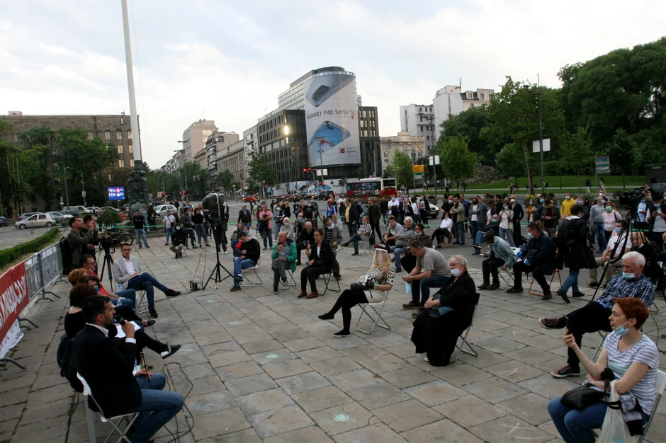 Ispred Doma Narodne skupštine održana je tribina na otvorenom u organizaciji Građanskog otpora, čiji su učesnici pozvali građane da bojkotuju parlamentarne izbore 21. juna.