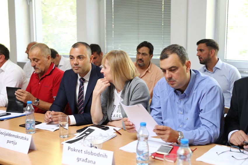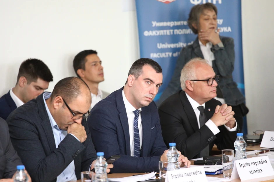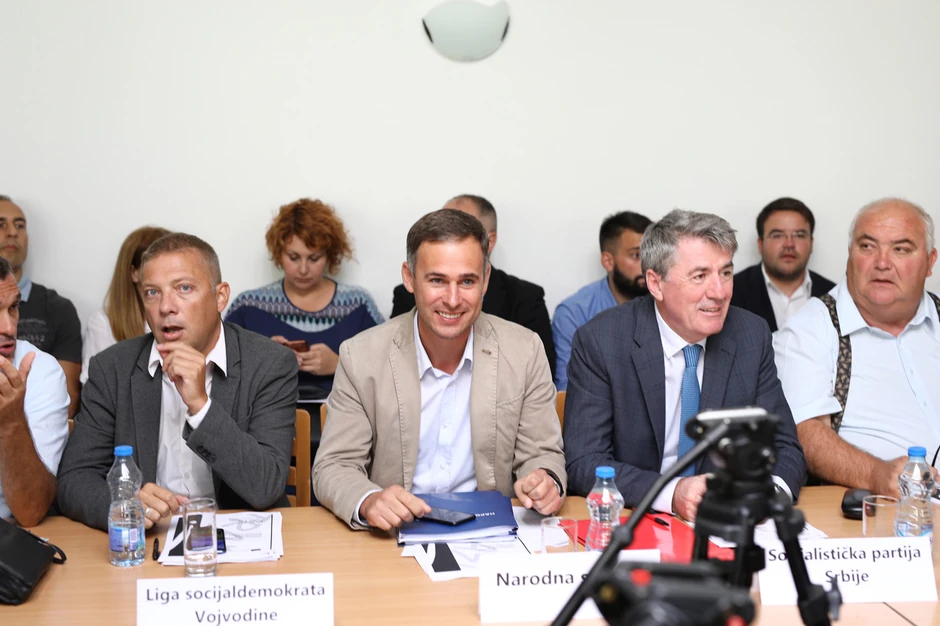Miroslav Aleksić se na početku sastanka pobunio što sedi na strani stola na kojoj su predstavnici naprednjaka, socijalista i Vulinove stranke.
