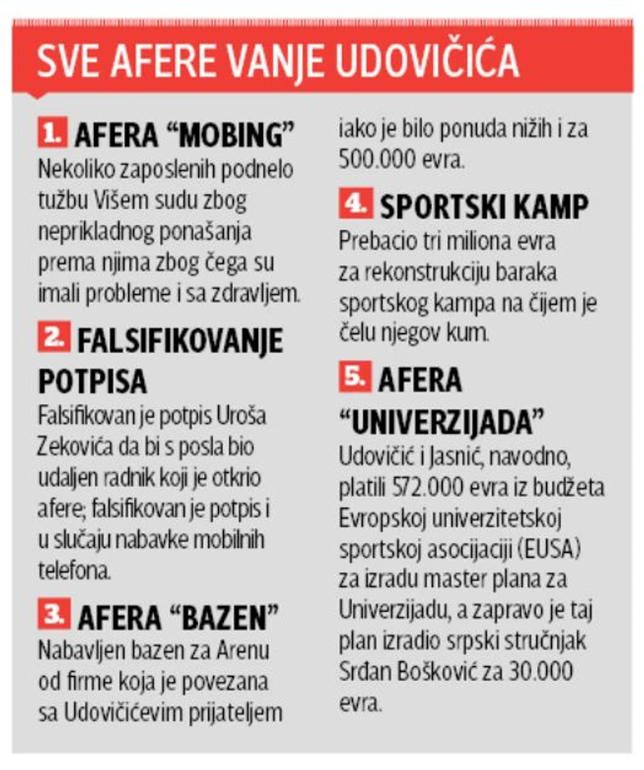 Inače, Udovičić je već viđen na izlaznim vratima u Nemanjinoj ulici nakon rekontrukcije Vlade koja se očekuje do kraja juna. Premijerka mu je najviše zamerila silne afere u vezi sa organizacijom Univerzijade 2020. godine koje je otkrio „Blic“, a u kojima je zajedno sa svojim saborcem Sinišom Jasnićem, donedavnim predsednikom USSS-a, proneverio iz budžeta 572.000 evra. Zbog tih malverzacija reagovali su čak i Tužilaštvo za organizovani kriminal, Uprava za pranje novca i Agencija za borbu protiv korupcije koji su započeli istragu, a sve to izazvalo je i buru na poslednjem kongresu Evropske univerzitetske sportske asocijacije (EUSA). I premijerka Brnabić pripretila je Udovičiću i Jasniću da Univerzijade u Beogradu neće biti ako ne dokažu da su čisti. Kako bi se odbranili, Udovičić i Jasnić su prošle nedelje osmislili nastupe u medijima u kojima su lažno optuživali "Blic" umesto da kažu gde je nestao novac.