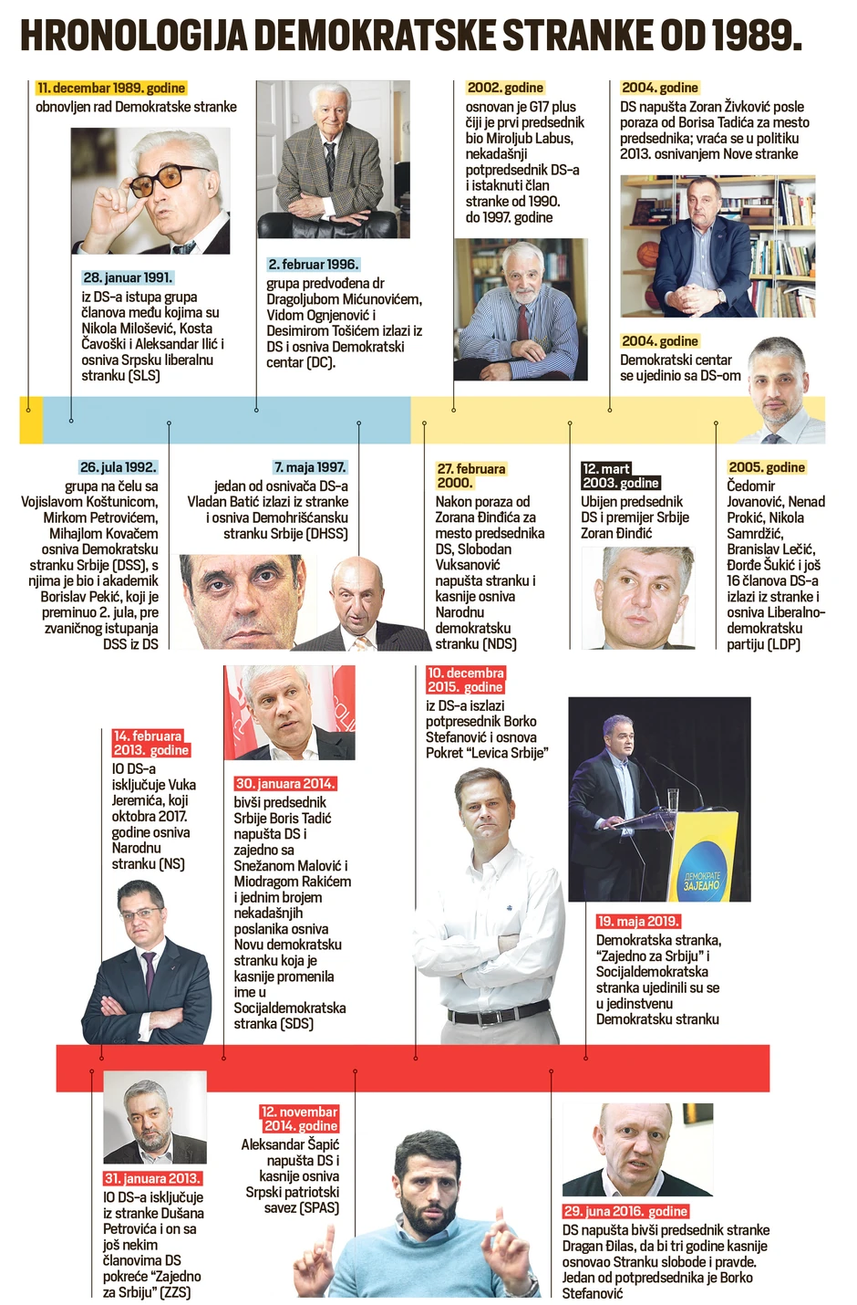 Demokratska stranka je i pre i posle petooktobarske revolucije "pravila i jela svoju decu". U poslednje tri decenije iz DS-a je direktno ili indirektno proizašlo čak 14 stranaka, od kojih polovina više ne postoji. Demokrate se, pak, nadaju da će se poslednje ujedinjenje sa Zajedno za Srbiju i SDS-om pretvoriti u pozitivan trend.