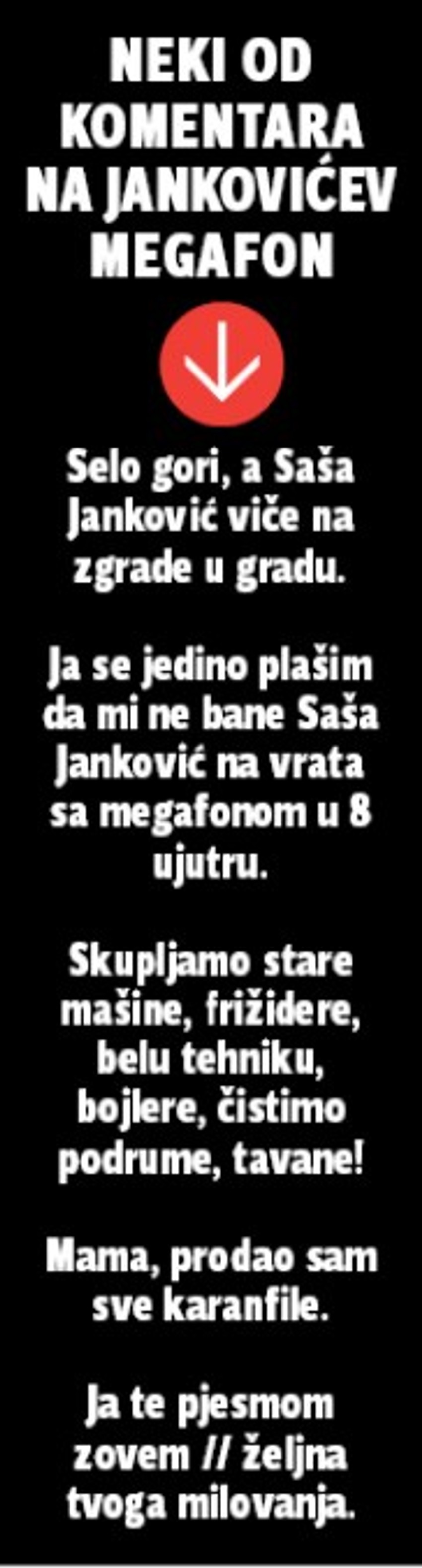 Slika Saše Jankovića koji sa megafonom uperenim u zatvorena vrata Predsedništva Srbije deklamuje spisak pitanja predsedniku Aleksandru Vučiću predmet je brutalnih, podjednako duhovitih i malicioznih šala na račun nekadašnjeg lidera opozicije.