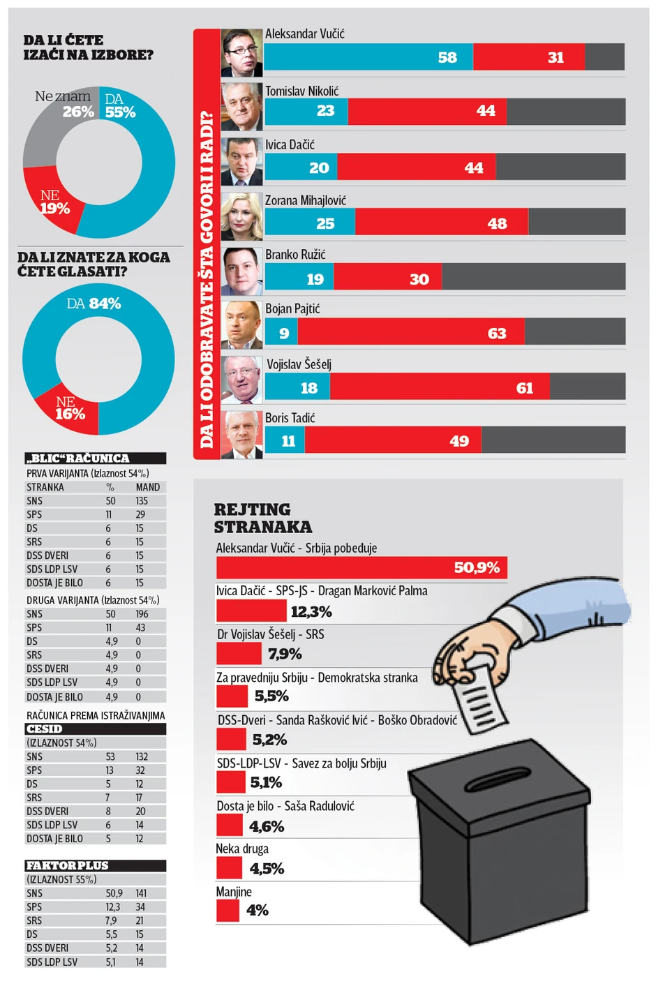 Ko će preći cenzus, uprkos istraživanjima, nemoguće je precizno predvideti. „Blic“ je napravio kalkulaciju u slučaju da izlaznost bude 54 odsto, SNS osvoji 50, a SPS 11 odsto glasova, a cenzus pređu DS, DSS-Dveri, SRS, SDS-LSV-LDP i Pokret Dosta je bilo sa po šest odsto glasova. U ovu računicu ukalkulisali smo i manjinske liste, za koje ne važi cenzus, računajući da će kao i na prethodnim izborima uzeti 11 mandata i računali devet izbornih lista za koje se prognozira da svakako ne prelaze cenzus.
