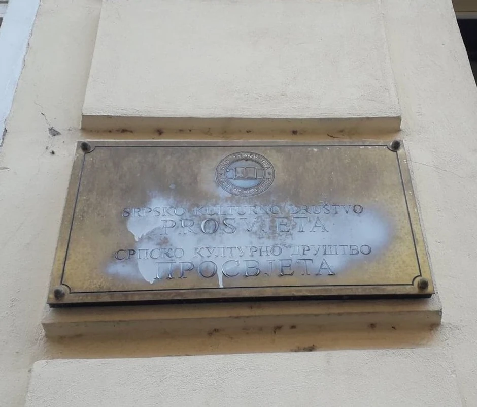 Nepoznati počinilac prefarbao je belom bojom ćiriličnu tablu Srpskog kulturnog društva "Prosvjeta" na ulazu u centralu društva u Zagrebu.