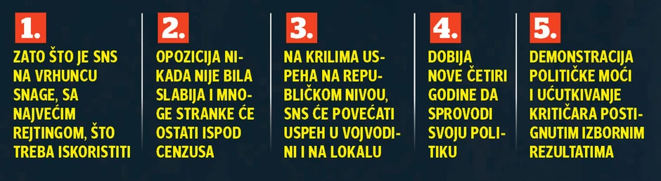 - Vanredni parlamentarni izbori bi učinili da Vučić osveži podršku za svoju politiku u biračkom telu i nastavi do kraja da realizuje ono što je započeo. Ubedljivom pobedom na republičkom nivou, povećao bi šanse svoje stranke i na lokalnim i pokrajinskim izborima kada je reč o rezultatu - kaže politički analitičar Dejan Vuk Stanković.