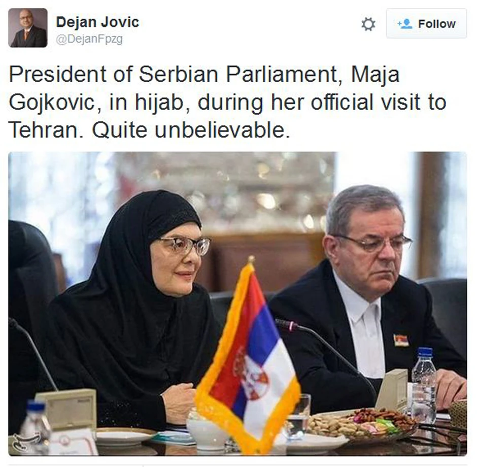 Tako je predsednici Skupštine Srbije pošlo za rukom ono što dosad nije nijednoj funkcionerki iz zapadnog sveta - da nimalo ne ispoštuje svoju tradiciju, a pritom da uvredi značajan broj žena u Iranu koje se bore za jednakost.