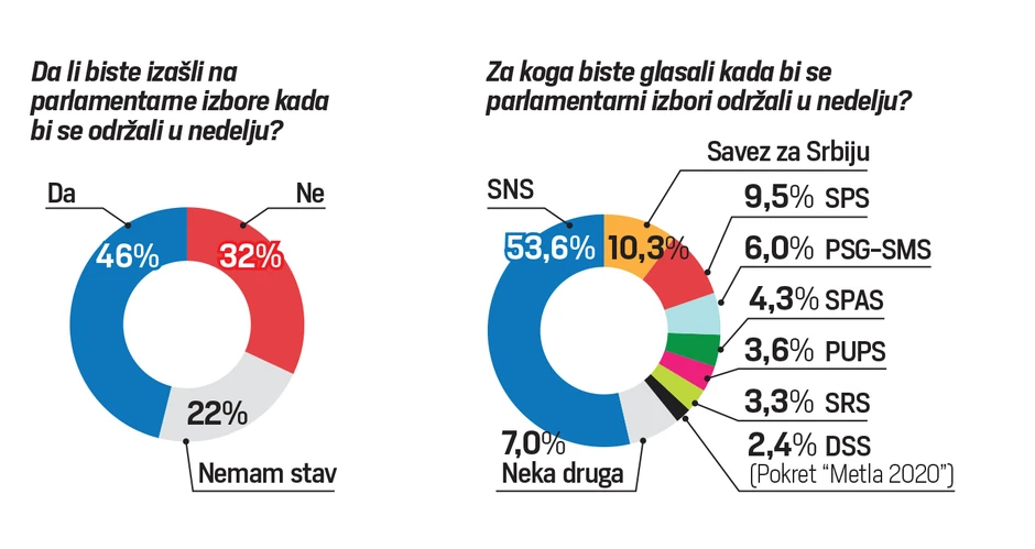 Ukoliko bi izbori bili održani ove nedelje, na njih bi kako ovo istraživanje pokazuje izašlo 46 odsto građana, 32 odsto ne bi, dok 22 ne zna ili nema stav.