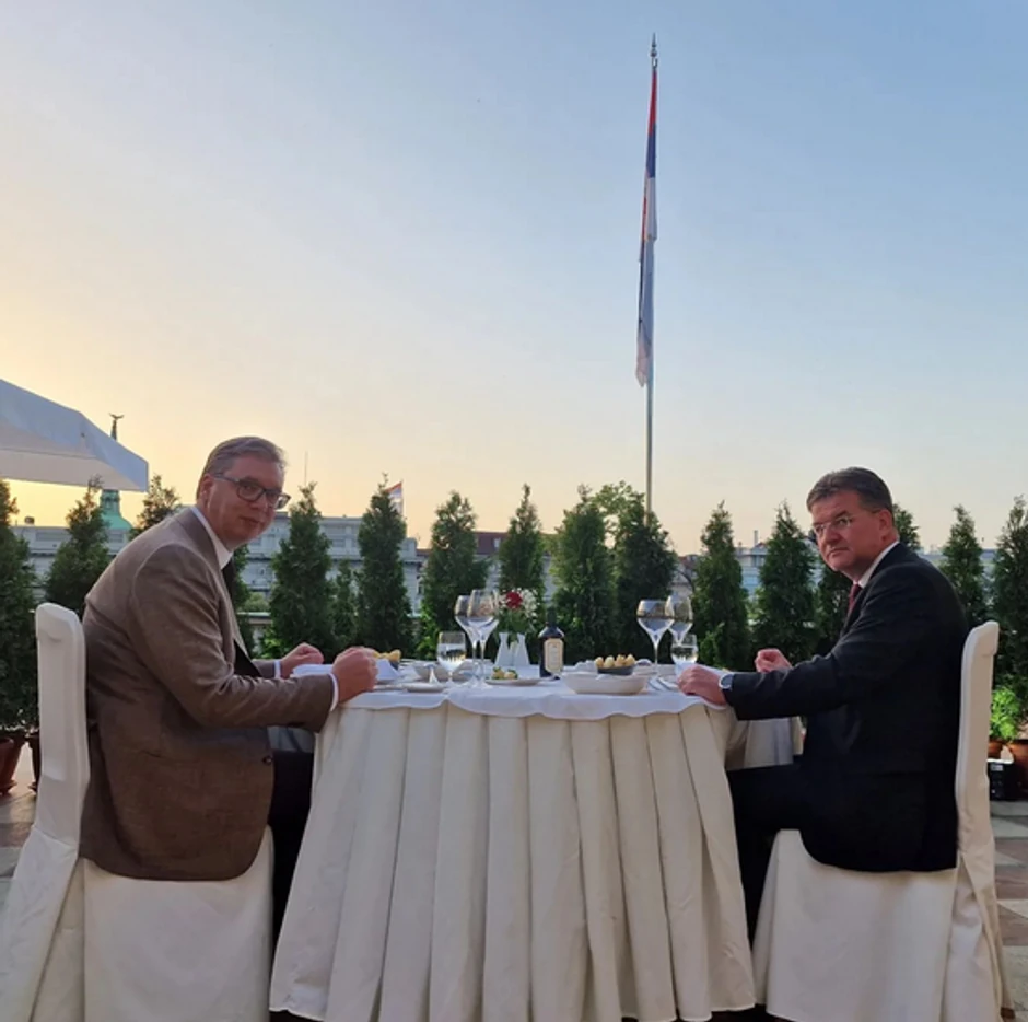 Predsednik Srbije Aleksandaar Vučić objavio je slike sa večere sa specijalnim izaslanikom EU za dijalog Beograda i Prištine, koja se održava u Predsedništvu Srbije.