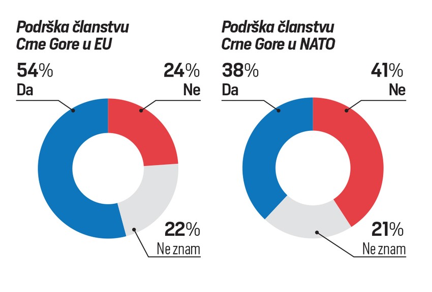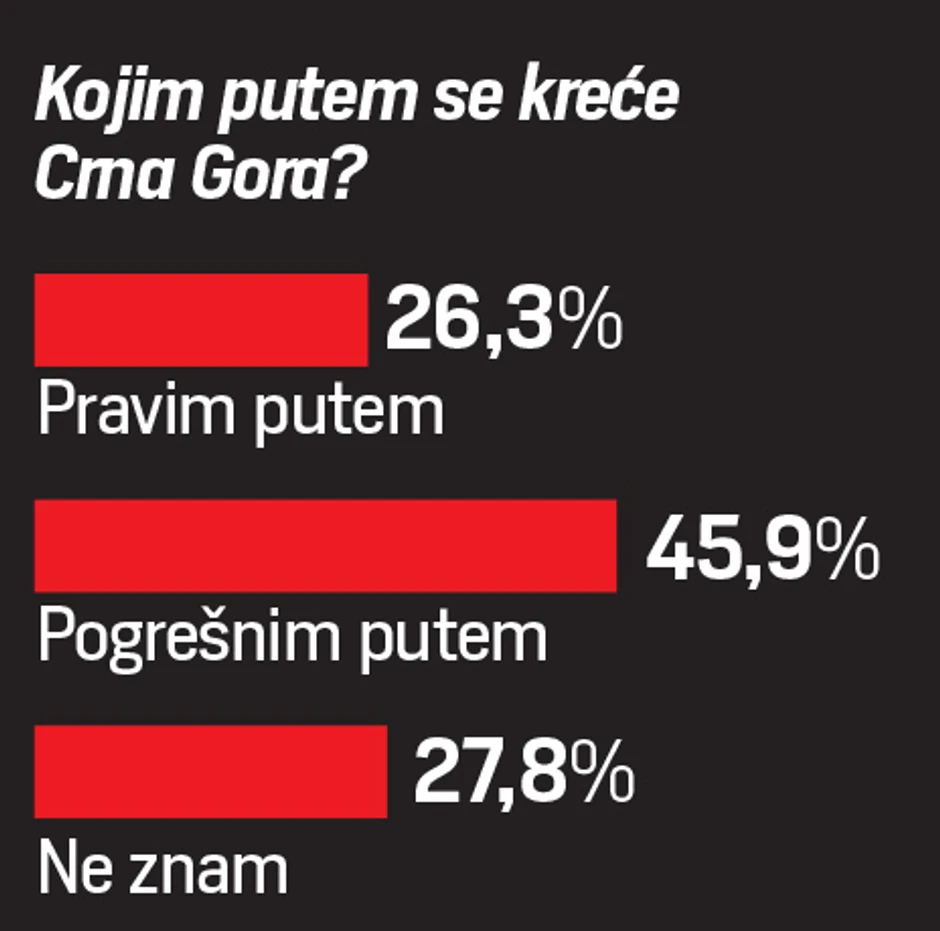 Važno je reći i da skoro polovina građana, 45,9 odsto, smatra da se Crna Gora kreće pogrešnim putem, nešto manje od trećine da se kreće pravim putem (26,3 odsto njih), a isti je procenat građana onih koji ne znaju ili ne mogu da procene (27,8).