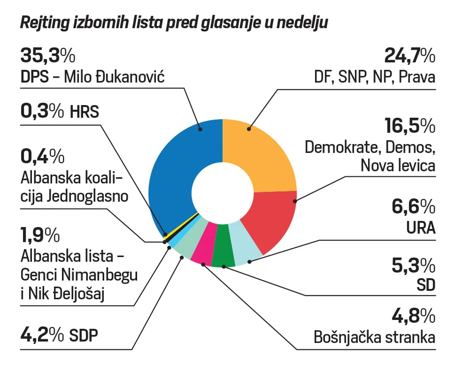 Ovo pokazuju rezultati istraživanja crnogorskog Centra za demokratiju i ljudska prava. Istraživanje "Političko javno mnjenje Crne Gore" sprovedeno je od 5. do 12. avgusta, a učestvovalo je 1.037 ispitanika. Izbori u Crnoj Gori zakazani su za 30. avgust, prijavljeno je 11 izbornih lista i sve one su bile na upitniku CEDEM-a.