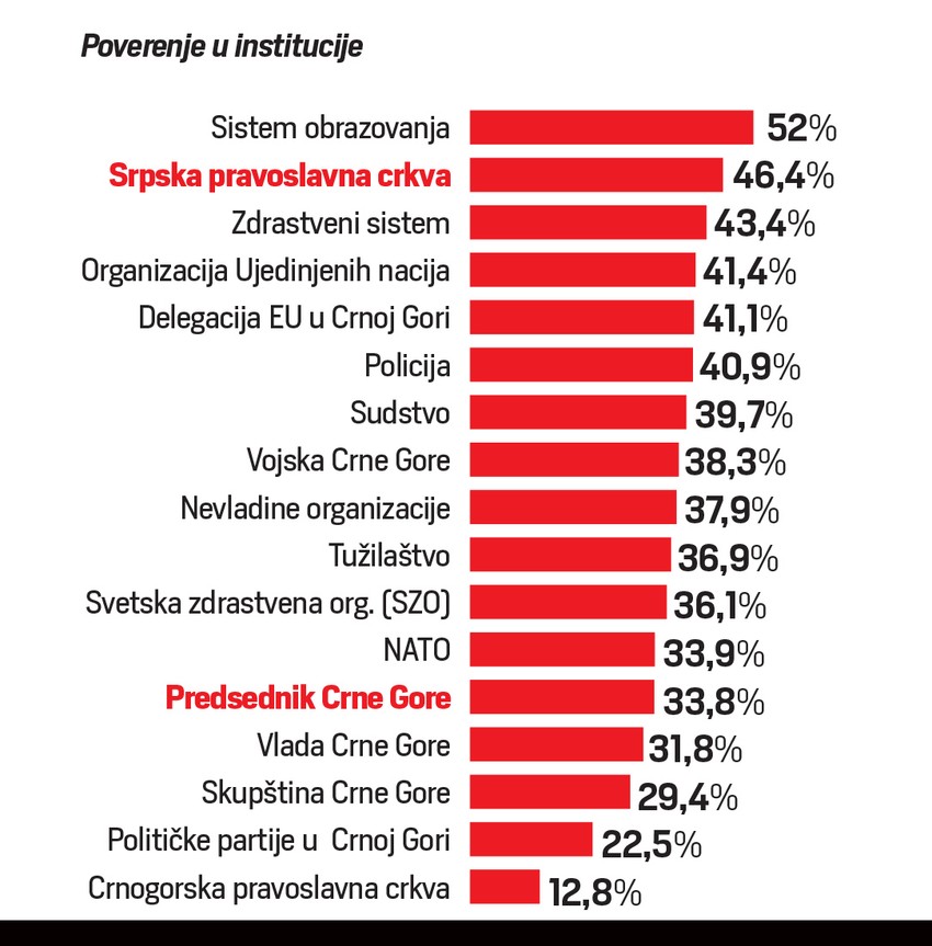 Kada je u pitanju poverenje u institucije, građani u Crnoj Gori imaju najviše poverenja u sistem obrazovanja, 52 odsto, pa u Srpsku pravoslavnu crkvu, a na trećem mestu je zdravstveni sistem sa 43,4 odsto podrške.