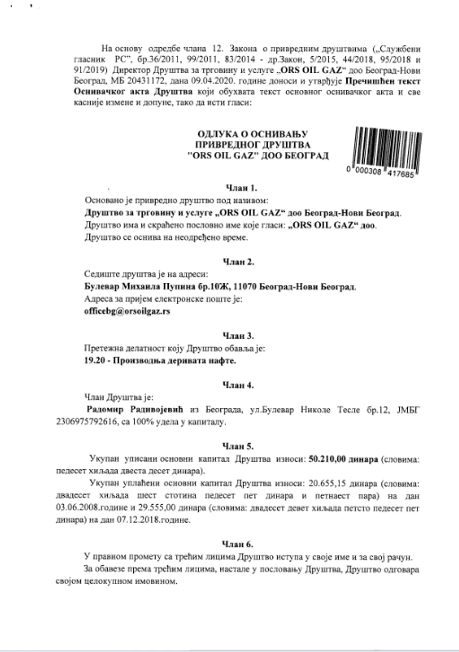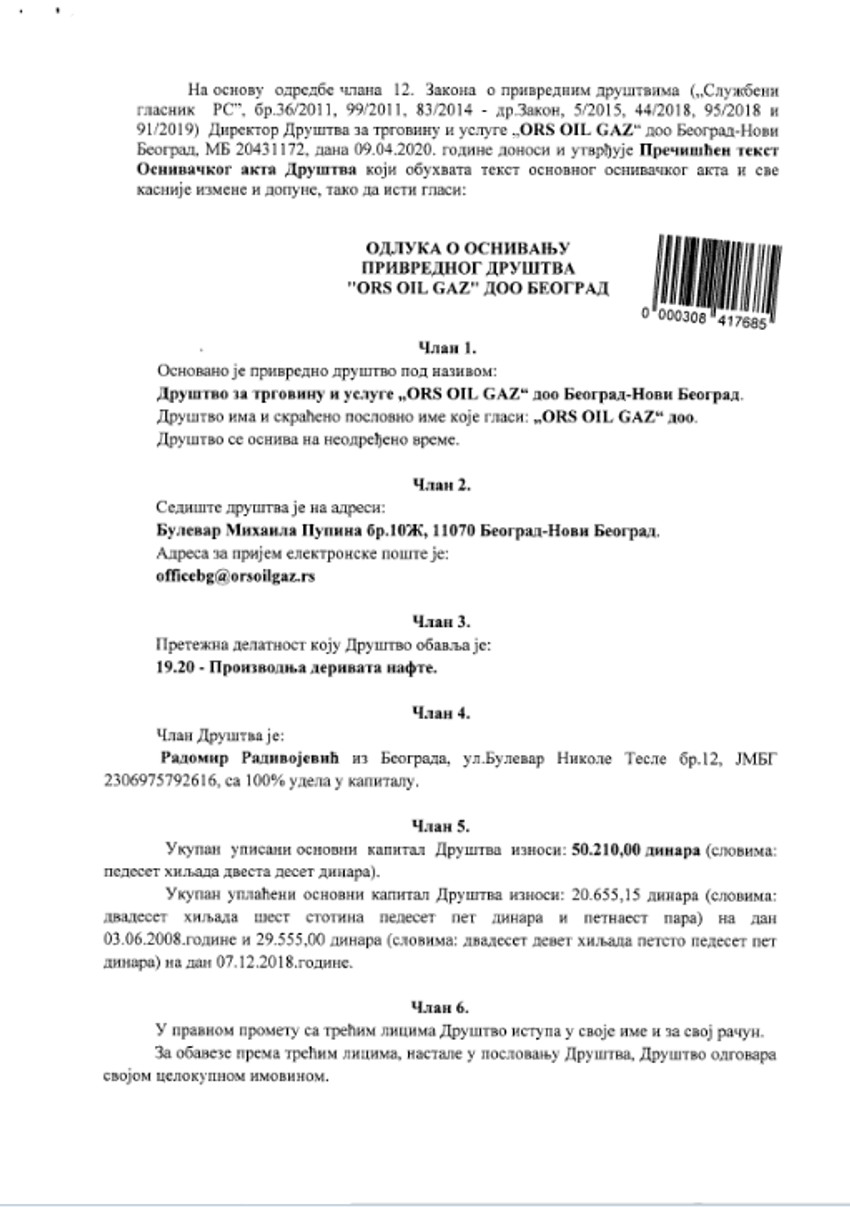 Zanimljivo je da je ova firma u registar upisana još 2008. godine, dok je Radomir Radivojević bio zamenik direktora "Komiko oila", a da joj je za više od deset godina poslovanja ukupan prijavljeni novčani kapital svega nešto više od 50 hiljada dinara.