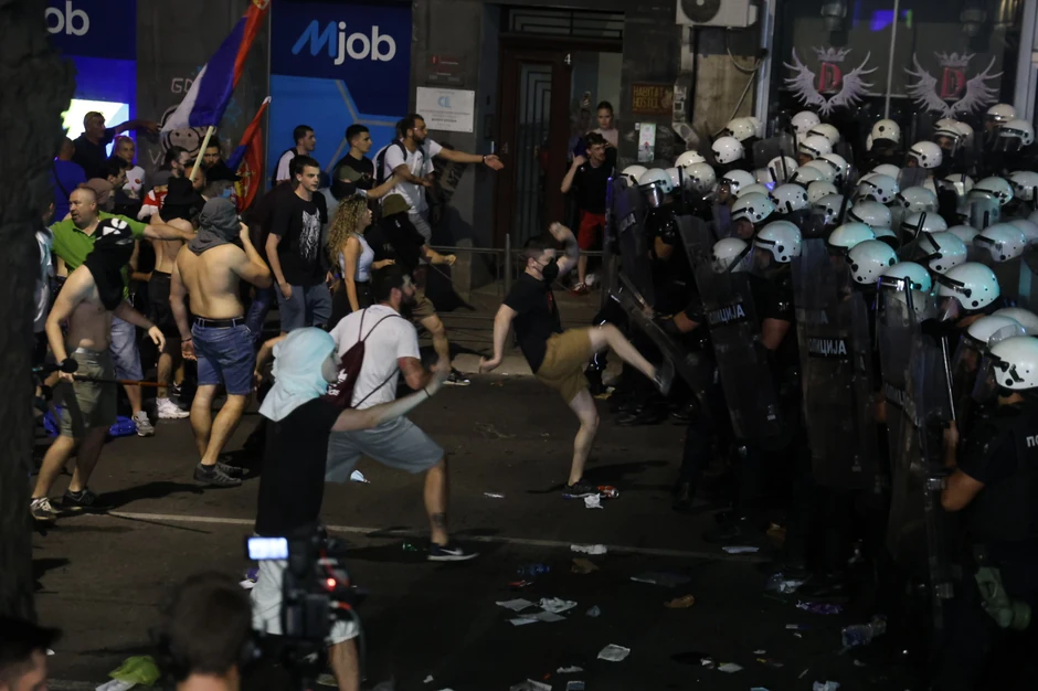 - Postoji opravdana sumnja da je Nikola V. 28. juna oko 23 časa u ulici Bulevar kralja Aleksandra, u visini crkve Svetog Marka, tokom neprijavljenog javnog skupa "Vidimo se na Vidovdan", okrivljeni vršio nasilje i bacao više staklenih flaša i jednu plastičnu flašicu vode na policijske službenike koji su stajali u kordonu, kao i kamenice i različita pirotehnička sredstva "topovske udare" i petarde, te se hvatao rukama za štitove policijskih službenika, nakon čega je lišen slobode - saopštili su u VJT-u.