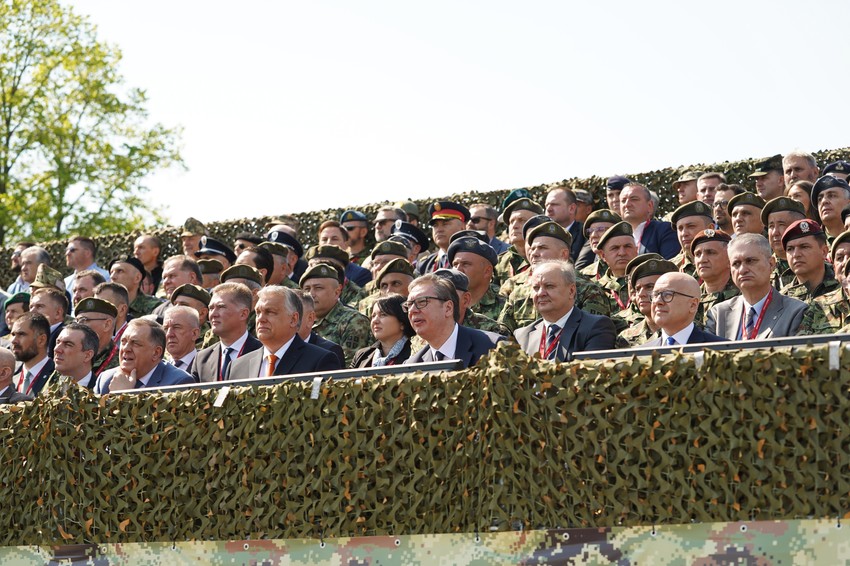 Događaju prisustvuje i mađarski premijer Viktor Orban, koji se jutros sastao sa Vučićem, premijerka Srbije Ana Brnabić, ministar odbrane Miloš Vučević, ministri u Vladi i drugi državni funkcioneri, predsednik i premijerka Republike Srpske Milorad Dodik i Željka Cvijanović...