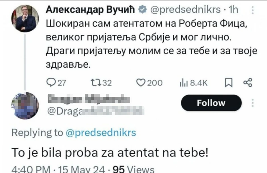 Predsednik Aleksandar Vučić oglasio se danas nakon atentata na Roberta Fica i tom prilikom izjavio da je šokiran takvim činom i poželeo brz oporavak slovačkom premijeru. Ispod Vučićeve objave pojavio se preteći komentar predsedniku. Tim povodom, reagovao je i premijer Srbije, Miloš Vučević, istakavši da oštro osuđuje pretnje smrću upućene Vučiću.