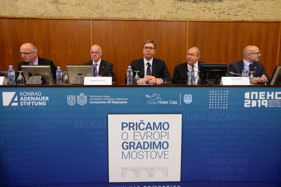 - Mi Evropu i danas priželjkujemo, očarani izlogom i dalje često punim skupocenog besmisla, a ona nas, tobož, ne vidi dobro i nekad nas se plaši kao nečeg nepoznatog. Mi na to reagujemo na dva načina - pokazujemo kao da smo je dostojni, ali se istovremeno inatimo. Volimo da živimo evroskim standardom, volimo da imamo izloge kao u Evropi. Ali, ako nam se nešto ne sviđa, makar to bilo i piianje KiM ili vladavine prava, u isto vreme okrećemo leđa Evropi i govorimo o njenom nepravednom odnosu prema svima nama. I za nas je Konrad Adenauer jedna od najznačanijih fondacija u Srbji, mnogo smo naučili od njih, da neke stvari sagledamo iz drugačijeg ugla. Današnje pitanje, pitanje Srbije u Evropi, je veoma komplikovano, a Lamert je jedan od najboljih govornika, a sebi je postavio devet dilema - kazao je Vučić.