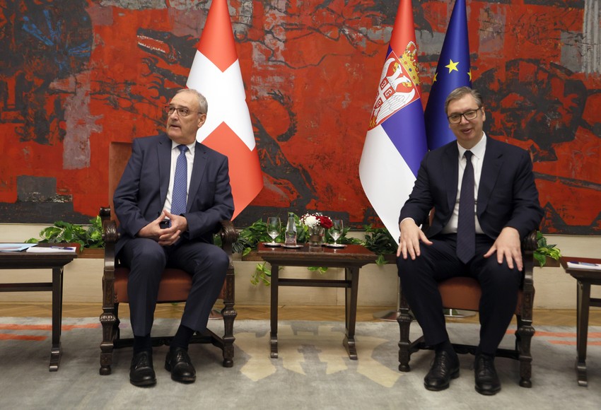 Predsednik Aleksandar Vučić izjavio je nakon razgovora sa predsednikom Švajcarske Gi Parmelanom da je veoma srećan što može posle 18 godina da ugosti švajcarskog predsednika i što su dve države za četiri puta uvećale trgovinsku razmenu.