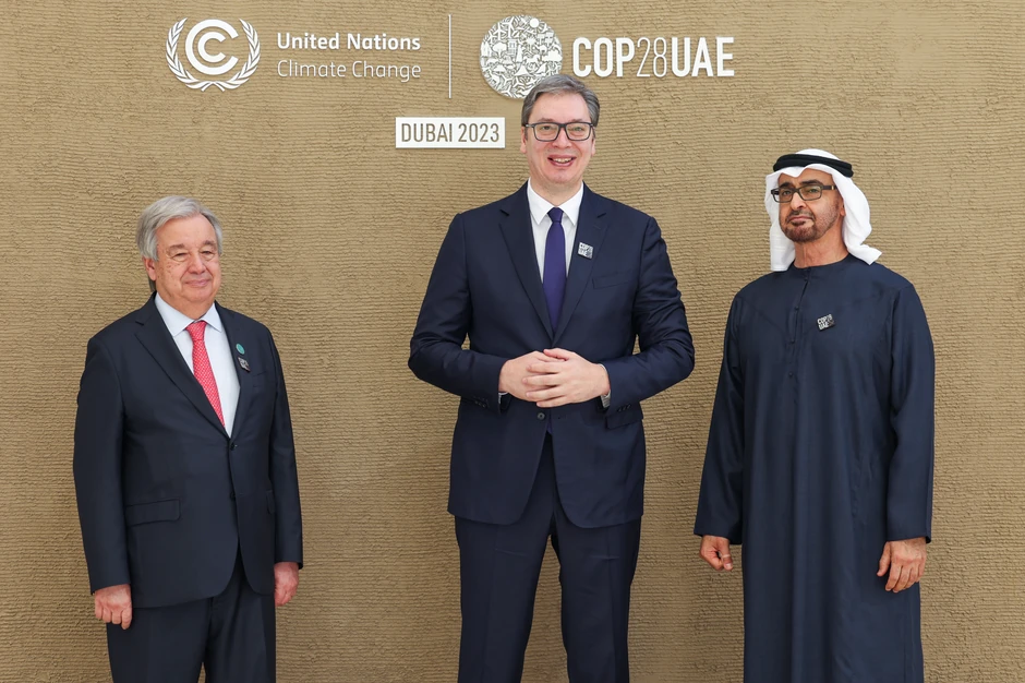 Predsednik se danas sastao sa predsednikom Ujedinjenih Arapskih Emirata šeikom Mohamedom bin Zajedom al Nahjanom, u Dubajiu, gde prisustvuje Samitu lidera, nakon čega je istakao da je šeik veliki prijatelj Srbije. Pre sastanka sa njim, imao je bilateralni sastanak sa francuskim kolegom Emanuelom Makronom, a posle njega sa turskim predsednikom Redžepom Tajipom Erdoganom i nemačkim kancelarom Olafom Šolcom.
