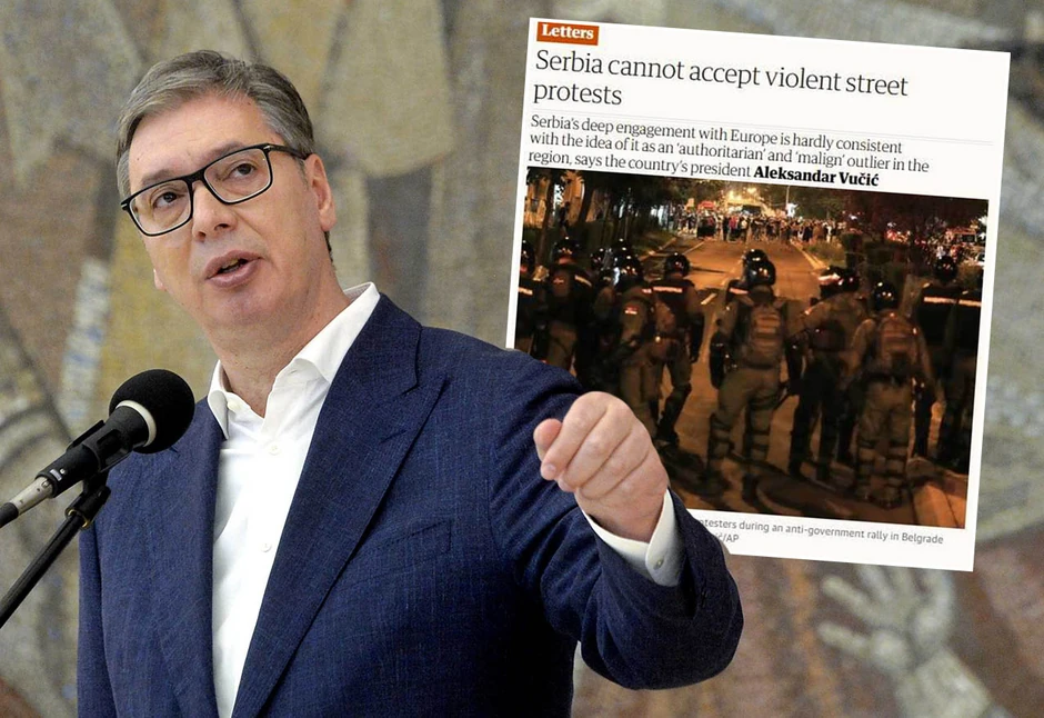 Predsednik Srbije Aleksandar Vučić odgovorio je pismom na tekst britanskog lista "Gardijan" od 25. avgusta i tom prilikom poručio da "država ne može i neće da prihvati nasilne ulične proteste", naglašavajući da je Srbija duboko povezana sa Evropom i da se, uprkos nemirima i povređenim policajcima, zemlja dosledno razvija u demokratskom i ekonomskom pravcu.