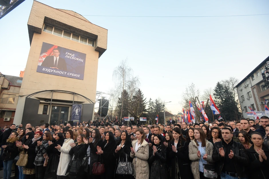 Predsednik Aleksandar Vučić poručio je danas u Leskovcu da je pristojna Srbija ustala, da sačuva svoju zemlju, i od onih iznutra i od onih spolja, koji bi da je sruše.