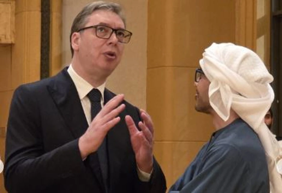 Predsednik Srbije Aleksandar Vučić sastao se potpredsednikom Vlade i ministrom spoljnih poslova UAE šeikom Abdulom bin Zajedom al Nahjanom uoči gala večere koju šeik priređuje za učesnike Nedelje održivosti 2026. u Abu Dabiju.