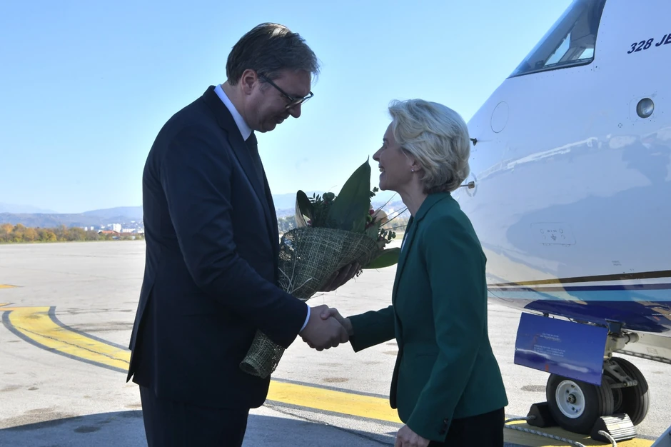 Predsednik Srbije Aleksandar Vučić dočekao je predsednicu Evropske komisije Ursulu fon der Lajen na niškom aerodromu "Konstantin Veliki".