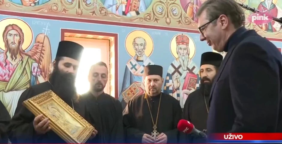 - Šta je potrebno crkvi - upitao je Vučić sveštena lica koja su ga dočekala i poklonili mu ikonu presvete Bogorodice.