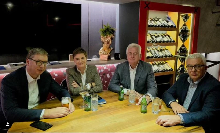 Predsednik Aleksandar Vučić oglasio se na svom Instagramu gde je istakao da je srećan što je u kafanu u Beogradu uspeo da dovede troje predsednika - Tomu Nikolića, Andriju Mandića i Anu Brnabić.