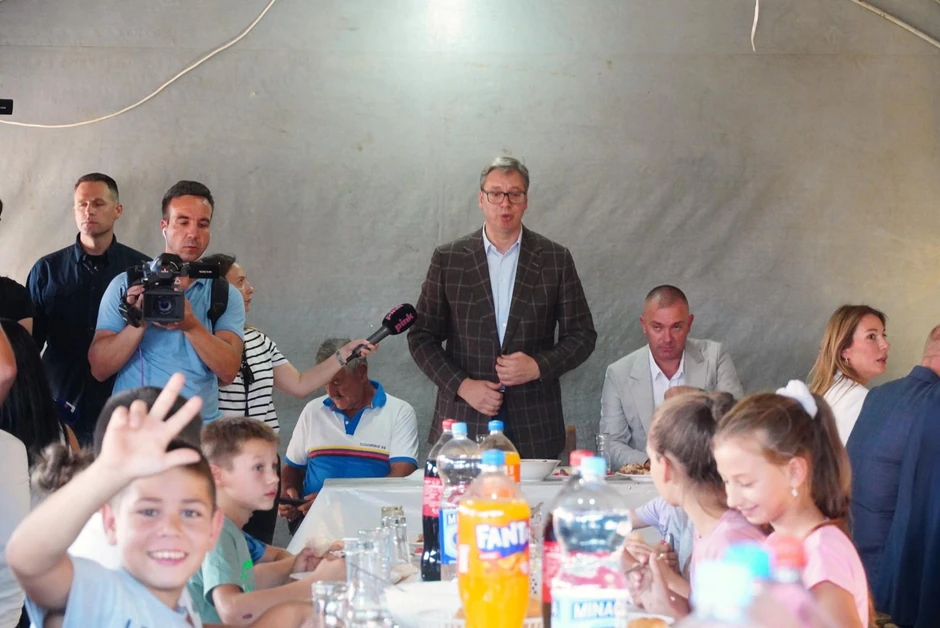 "Ja hoću svima da se zahvalim na gostoprimstvu, što ste nas ovako dočekali, hvala na ljubavi koju osećate prema Srbiji i hvala na divno pripremljenom jelu. Posebno sam srećan što vidim ovoliko radosne dece. Ovo oko puta obećali smo dole u nastavku još kilometar i po, ukupno 6,5 kilometara. Koliko u naredna tri-četiri dana, mašine će da dođu da rade, da probamo da završimo što je moguće pre", rekao je Vučić obraćajući se okupljenima.