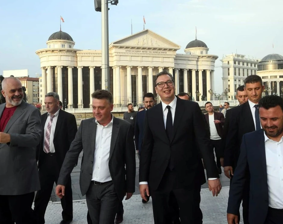 Predsednik Srbije Aleksandar Vučić prošetao je večeras Skopljem sa svojim domaćinom makedonskim premijerom Zoranom Zaevom i premijerom Albanije Edijem Ramom.