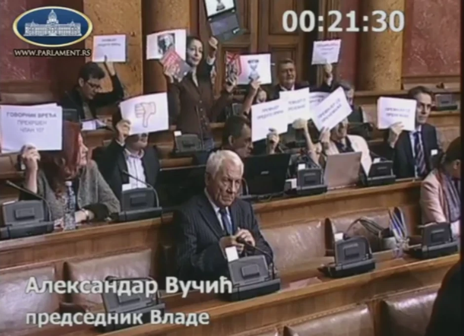 Dok je Vučić govorio poslanici Dosta je bilo držali su crteže s likom Pinokija.