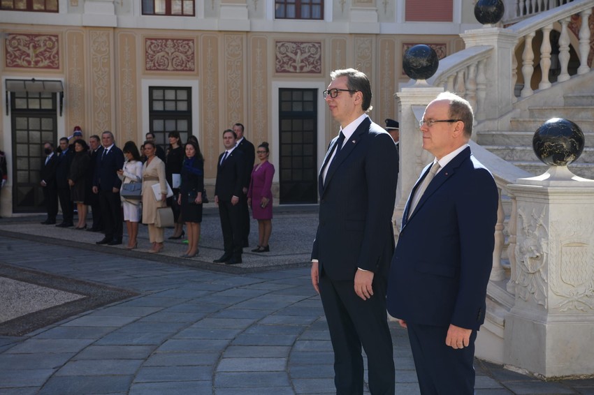 Uz postrojenu Gardu i himne dve zemlje, knez Albert srdačno je dočekao predsednika Vučića, a na Kneževskoj palati se, zbog ove posete, uz zastavu Monaka vijorila i zastava Srbije.