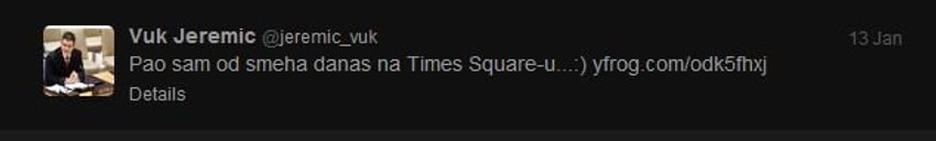 Predsednik Generalne skupštine Ujedinjenih nacija Vuk Jeremić objavio je na svom profilu na Tviteru fotografiju čoveka obučenog u kostim Sunđer Boba, popularnog lika iz crtaća, s kojim su Jeremića često poredili zbog izvesnih fizičkih sličnosti.
