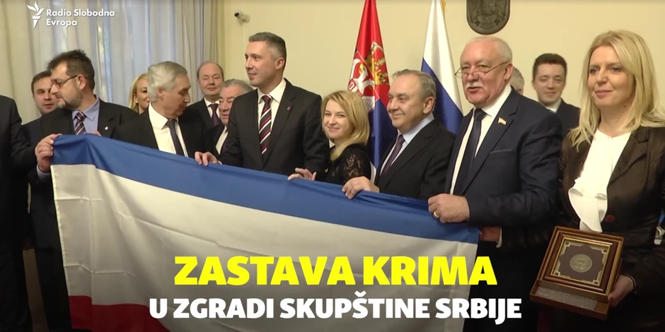 Natalija Vladimirovna Poklonskaja, zamenica predsednika Odbora za spoljne poslove Državne Dume Ruske Federacije, zajedno sa liderom opozicione političke partije u Srbiji "Dveri" Boškom Obradovićem, pozirala je novinarima ispred zastave krimske oblasti u jednoj od zgrada Skupštine Srbije, u ulici Kralja Milana.