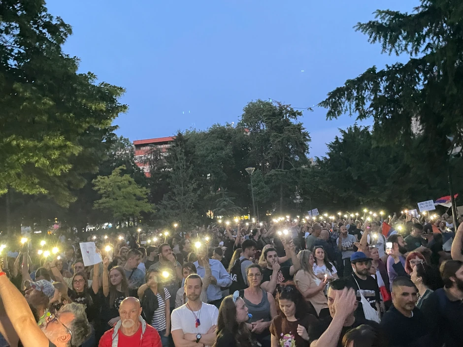 U međuvremenu, oko 20.30 sati okupljeni su ispunili Pionirski park, gde su se smestili do ograda kojima je ograđeno Predsedništvo na Andrićevom vencu.