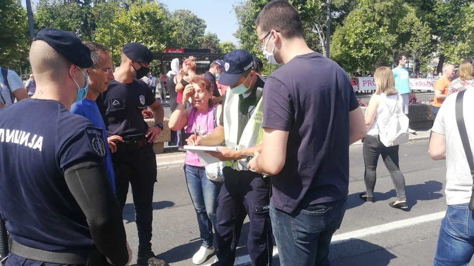 Kako javlja naš reporter sa lica mesta, građanima koji protestuju ispred Doma Narodne skupštine pripadnici saobraćajne policije uzimaju podatke i pišu kazne.