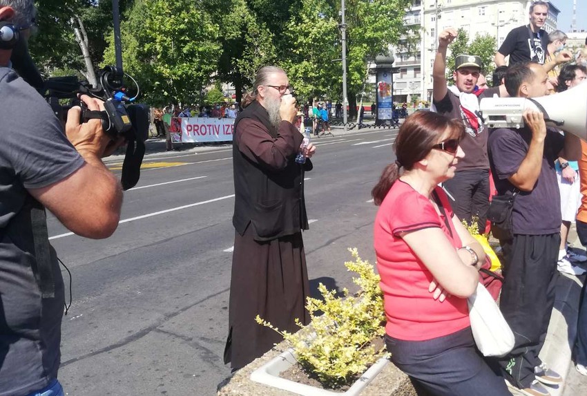 Pored Saše Radulovića, među okupljenima je viđen i raščinjeni monah Antonije Davidović sa megafonom.