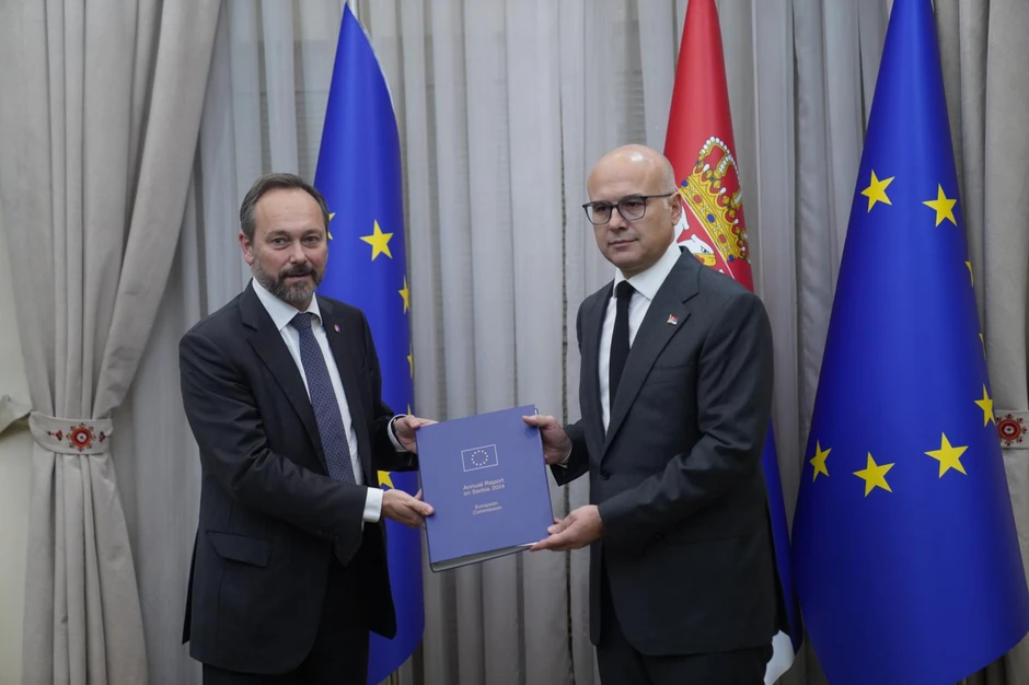 "EU konstatuje napredak Srbije u brojnim oblastima, pre svega, u oblastima ekonomije", rekao je na konferenciji za medije Vučević kome je šef Delegacije EU u Srbiji Emanuele Žiofre predao Izveštaj Evropske komisije za Srbiju za 2024. godinu.