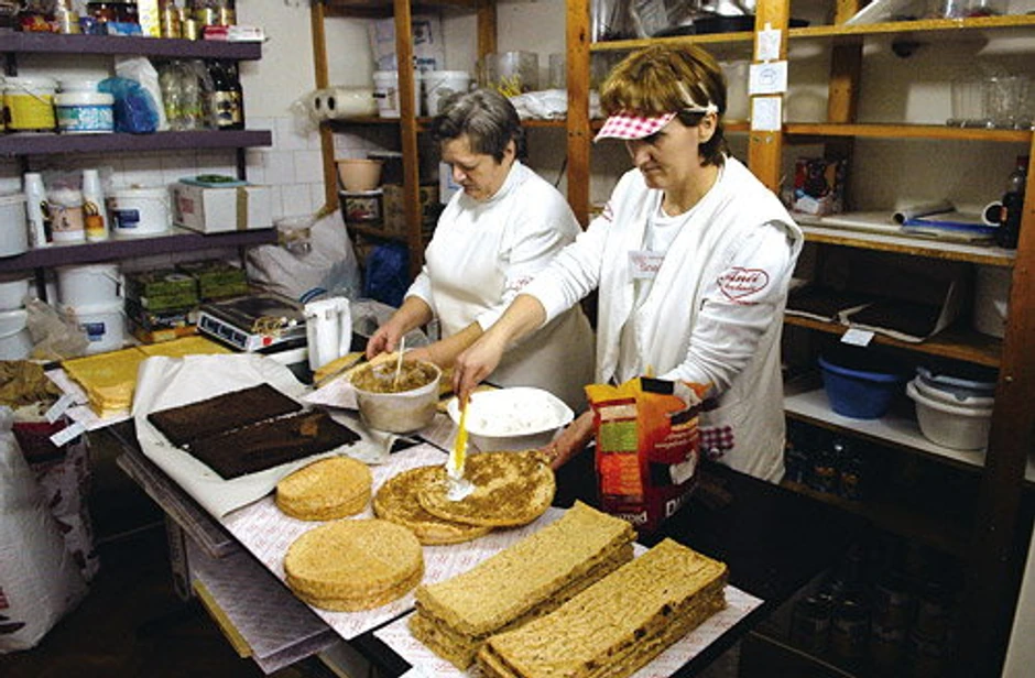 Red šale, red ozbiljnog rada, kuvano vino koje se greje na šporetu, miris čokoladnog krema i tek ispečenih kora za tortu deo su svakodnevne atmosfere u radionici za izradu kolača “Anči kolači” u Pančevu. Sneža, Goca, Ljilja, Ilonka, Lidija, Vesna i Nela užurbano, ali veoma organizovano kuvaju filove, valjaju vanilice u prah šećer, filuju torte i prave smese za kore.
